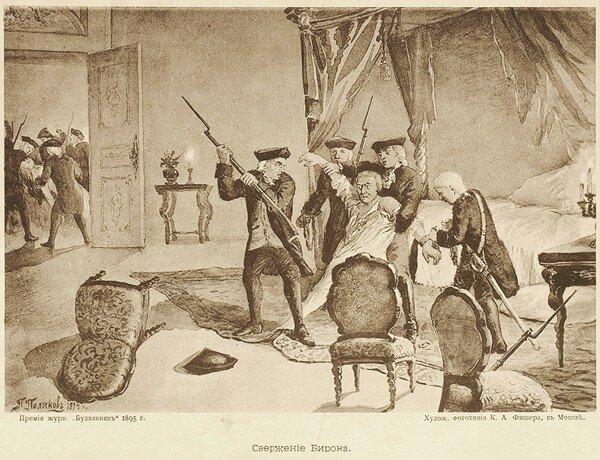 Перед смертью Анна Иоанновна назначила своим наследником двухмесячного Ивана Антоновича, а регентом при нём — своего фаворита, Эрнста Иоганна Бирона. Однако Бирону не удалось удержать власть: его стремление к абсолютному контролю настроило против него родителей младенца-императора и гвардию, которая давно испытывала к нему неприязнь. Переворот организовал его же ближайший соратник, Миних. 9 ноября 1740 года Миних и гвардейцы арестовали Бирона, отправив его в заключение в Шлиссельбургскую крепость.